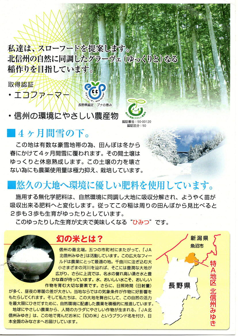 | 商 品 名 | 長野県(JAながの飯山)幻の米(ブナの恵)コシヒカリ-農薬5割減 | ||